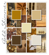 Gold Shimmer links together metallic gold and silver with warm yellow-based neutrals. Natural elements like gilded leaves, bark, and branches provide complex forms to the modern industrial metallic elements. Look also for traditional and nostalgic images or objects featured in gold and then presented in a clean modern space accented with warm neutrals. Animal skins, rustic logs, and leaves work beautifully to inject a global and ethnic feel. Gango Editions ColourSheen provides an excellent metallic base to images suited for the Gold Shimmer palette.